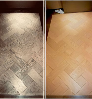 Complete restoration of wood floors through detailed sanding that removes existing finish and color.